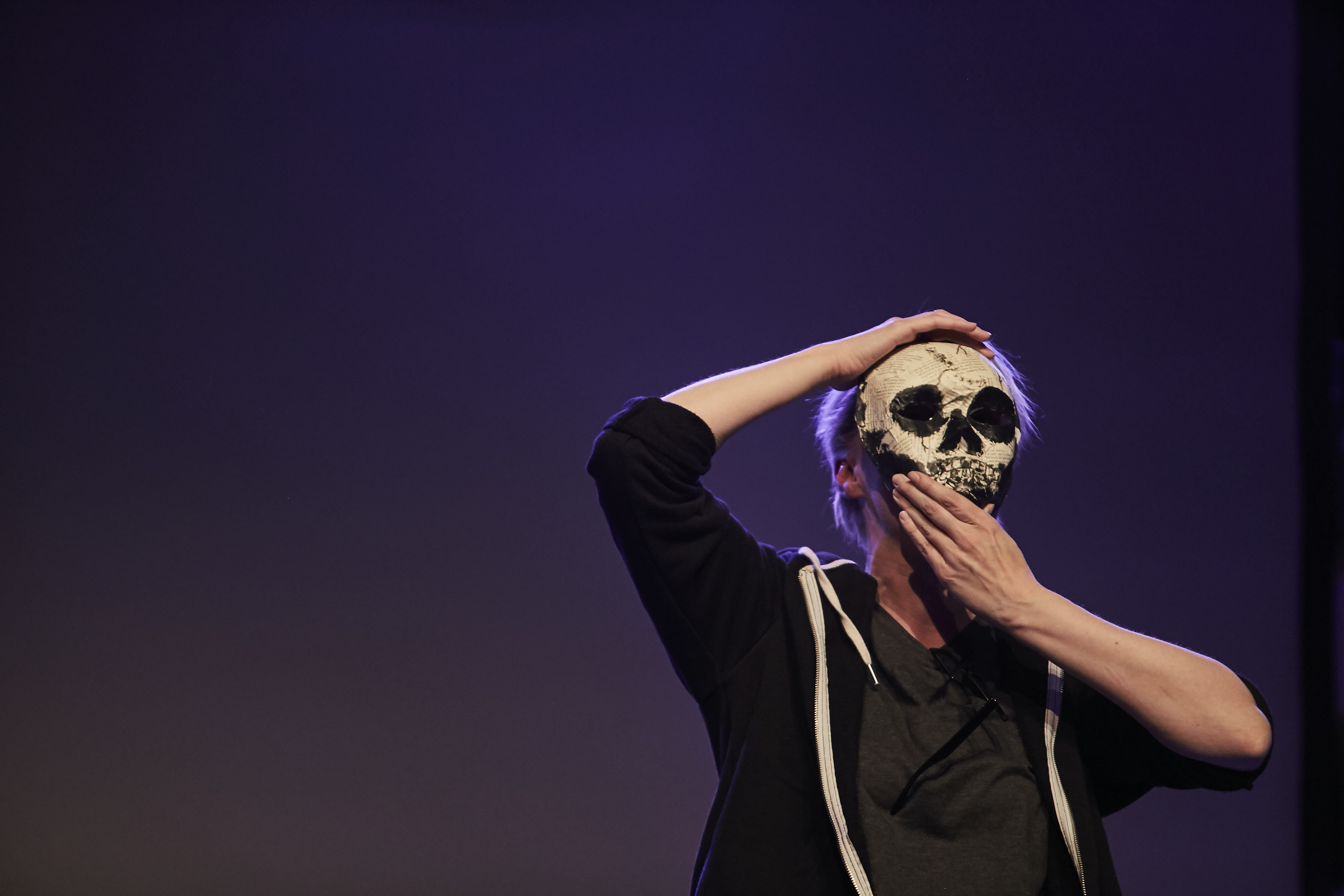 As I walked into the Theatre I noticed somebody sitting centre stage. Their hoodie was pulled up over their face. They sat cross-legged and had their arms out stretched. Every now and again they would screw their hands into tiny balls and release them again.